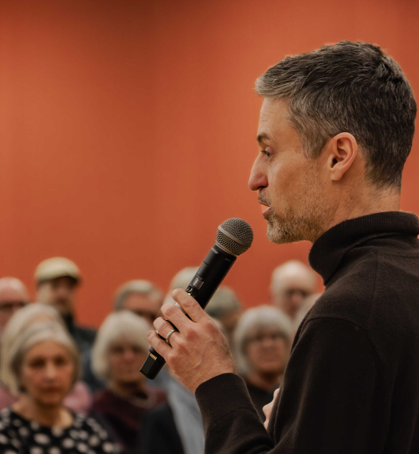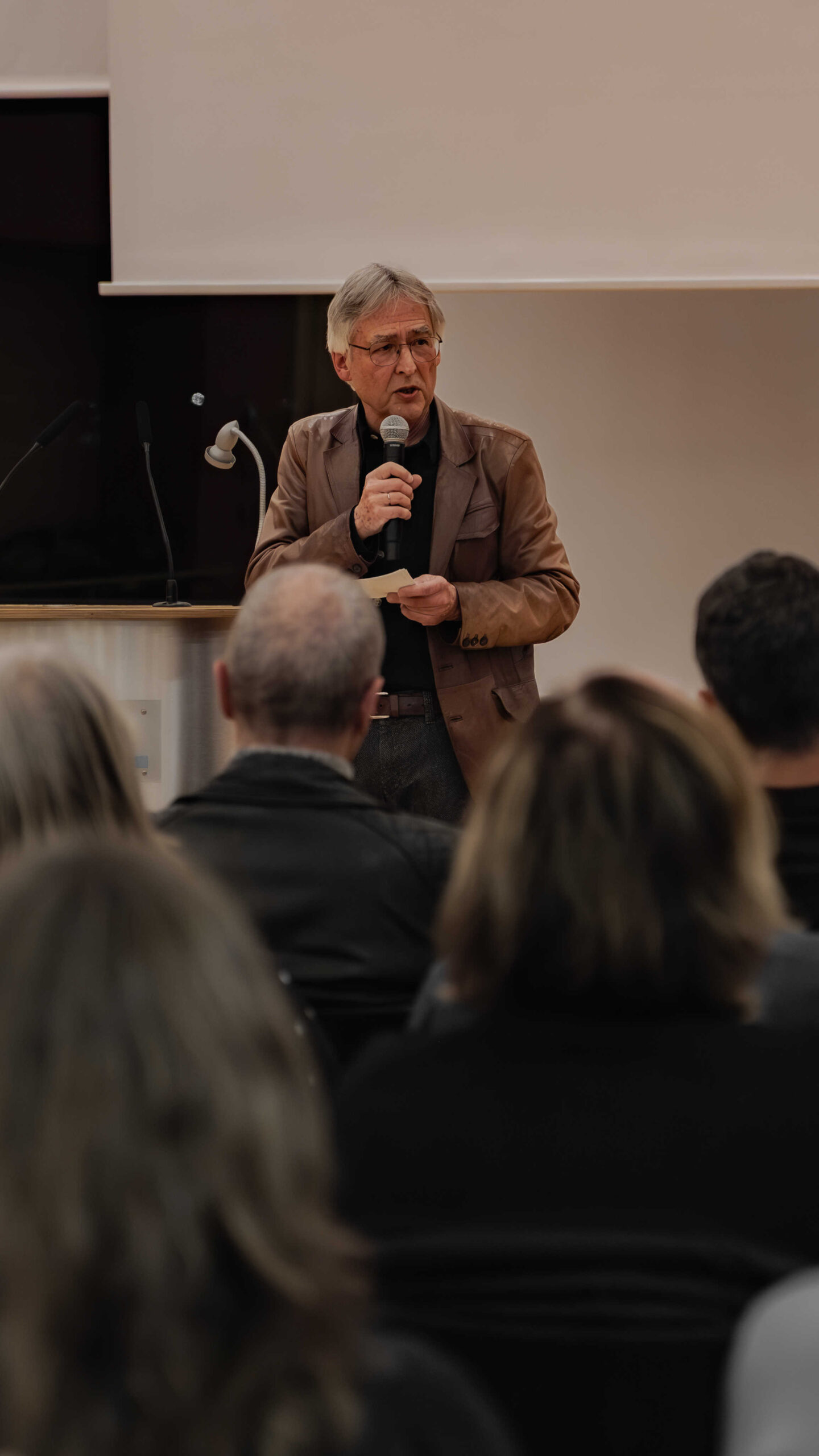 Meron Mendel ging beispielhaft auf mehrere aktuelle Vorkommnisse im Zusammenhang mit dem lang andauernden Nahost-Konflikt und der (Miss-)Deutung der deutschen Staatsräson ein. Den vielfach kontroversen Sichtweisen und der Berichterstattung darüber in den Medien stellte er seine eigenen Gedanken gegenüber und regte damit auch im Publikum zu kritischem Nachdenken an.